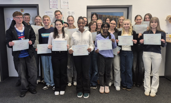 Im vergangenen Schuljahr bereiteten sich 23 Schülerinnen und Schüler der Klassenstufen 8-10 auf die DELF-Prüfung vor. Nach der freudigen Nachricht im Juni, dass alle bestanden haben, trafen nun die Sprachdiplome aus Paris ein. Bei der Übergabe durch unsere stellvertretende Schulleiterin Frau Aufdermauer war die Freude spürbar - strahlende Gesichter zeugten vom Stolz über die erbrachte Leistung.