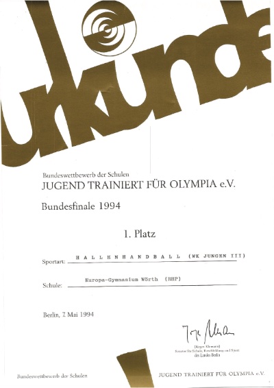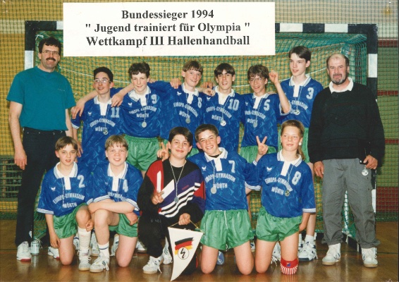 Schaut man noch etwas weiter in die Schulsportgeschichte des EGW zurück, so findet man eine bis heute einzigartige Leistung, auf die die Schule heute noch mit großem Stolz zurückschaut: 1994 wurde das Europa-Gymnasium Wörth Deutscher Meister im Schulhandball.