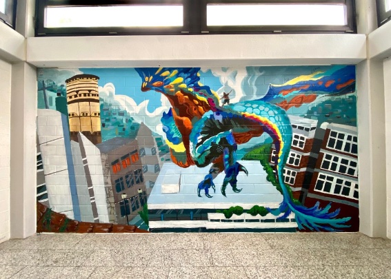 Das erste „Wall Painting“, ein Entwurf von Janne Ries, thematisiert den Sommer und erzählt von der Reise eines schillernden Drachens (in Reminiszenz an Eugywö, das Schulmaskottchen der Orientierungsstufe), auf dessen Rücken eine dem Flugwind trotzende Figur steht. Das imposante Gespann schwebt über der Stadt Wörth und ist im Begriff auf dem Dach des Europa-Gymnasiums zu landen oder auch abzuheben. Die Reisenden haben einen Stopp in der Schule eingelegt – ein Lebensabschnitt beginnt oder…