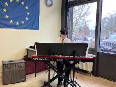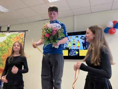 Begonnen und beschlossen wurde die Feier mit Stücken von Frédéric Chopin, dargeboten von Giao Le Van am E-Piano. In seiner Begrüßung verwies Dr. Hauptmann auf die langjährige Tradition des Bili-Unterrichts am EGW und auf dessen Ziel: gemeinsames Verstehen und Begreifen kultureller Gemeinsamkeiten. Landrat Martin Brandl bedauerte zwar seine eingerosteten Französischkenntnisse, betonte aber gleichzeitig humorvoll die bestehenden pfälzisch-frankophilen Verbindungen. Steffen Weiß warf ein kurzes Schlaglicht auf eine deutsch-französische Vergangenheit, die einst geprägt war von Ressentiments gegenüber dem „Erzfeind“ jenseits der nahen Grenze. Dabei, so der Wörther Bürgermeister, sei es Franzosen und Deutschen gelungen, in den Nachkriegsjahrzehnten Vorurteile ab- und Freundschaften aufzubauen, die in politisch unsicheren Zeiten unerlässlich für ein prosperierendes Europa sind. Dr. Oebel, Ministerialdirektor des Bildungsministeriums, fasste das heutige deutsch-französische Verhältnis treffend zusammen: „Deutschland braucht Frankreich. Frankreich braucht Deutschland. Europa braucht Deutschland und Frankreich, Deutschland und Frankreich brauchen Europa.“ Stellvertretend für alle Französisch-Lehrerinnen des EGW legte Lucile Thoyer dar, „warum die, die den Preis bringen, auch wissen, warum sie ihn ans EGW bringen“. Im Stile einer Nachrichtensendung, gewürzt mit Ironie und Schalk, gewährte ein unter der Leitung von Anja Höfler und Amaya Hoffmann entstandenes Video Einblicke in die Themenbereiche, mit denen sich der Französisch- und der Bili-Unterricht tagtäglich auseinandersetzen. Schülerinnen und Schüler der 8. Klasse inszenierten eine Etappe der Tour de France am EGW, in der der französische Generalkonsul Nicolas Bergeret zum Etappensieger avancierte. Eben jener war extra aus Frankfurt angereist, um die Auszeichnung „Label FrancÉducation“ persönlich zu überreichen.