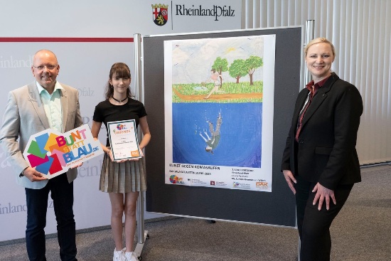 Beim diesjährigen Plakat-Wettbewerb der DAK zum Thema Alkoholmissbrauch "bunt statt blau" wurde Laura Reimann aus der Klasse 8b mit dem 2. Platz auf Landesebene ausgezeichnet. Laura setzte sich gegen rund 400 Teilnehmerinnen und Teilnehmer im Land durch. Die Schirmherrin des Wettbewerbs, die rheinland-pfälzische Sozialministerin Dörte Schall, überreichte die Urkunde in einer Feierstunde in Mainz.