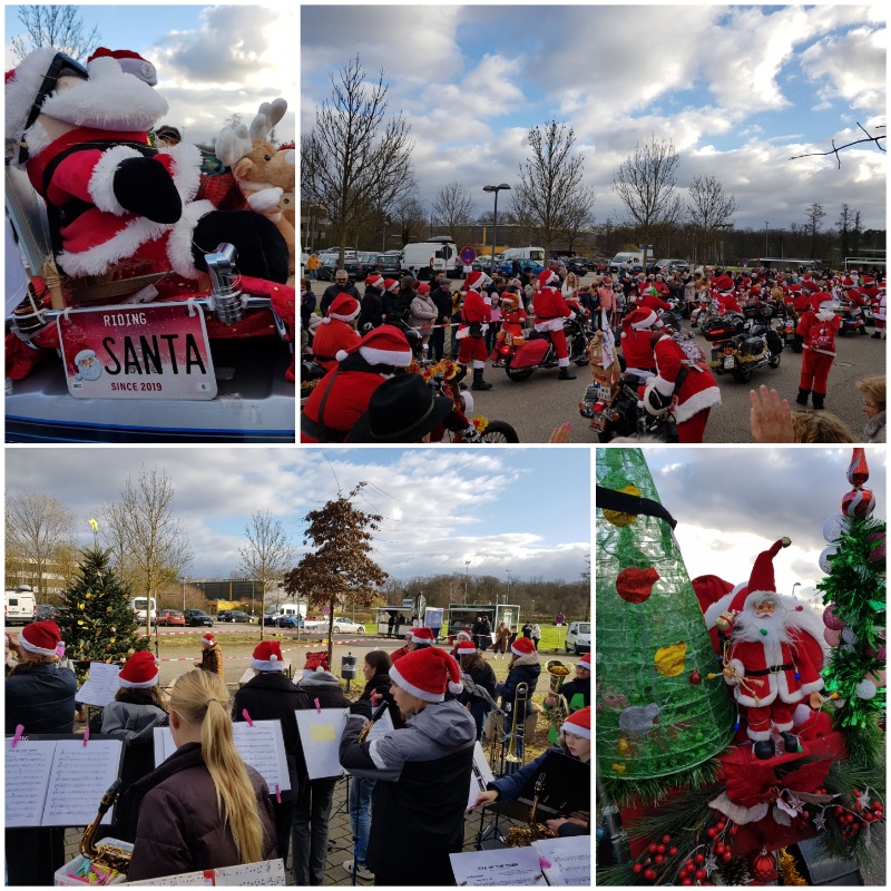Am Nikolaustag machten die weit über die Grenzen unserer Region hinaus bekannten riding Santas an der Bienwaldhalle in Kandel Station, um nicht nur für die „Schwächsten der Kinder“, die auf die Arbeit des Kinderhospizes Sterntaler angewiesen sind, Geldspenden zu sammeln, sondern auch den anwesenden Kindern (und Erwachsenen) eine besondere Freude zu machen. Rund zwei Dutzend Motorräder mit in Weihnachtsmann-Montur gekleideten Fahrerinnen und Fahrern ließen die Motoren zur Begrüßung aufheulen, sangen dann ihre eigene Version des Weihnachtsliedes Jingle Bells. Für die Jubiläumstour 2024 hatten die ehrenamtlichen Spendensammlerinnen und -sammler gut 3500 Päckchen gepackt, die sie an jeder der 15 Stationen von Jockgrim nach Landau an die Kinder verteilten. Musikalisch umrahmte die Big Band unserer Schule unter der Leitung von Markus Metz auf Einladung des KuKuK e. V. die Veranstaltung und sorgte mit ihrem Beitrag für einen überaus gelungenen und eindrücklichen Nachmittag. Wir danken an dieser Stelle für die Möglichkeit, unsere musikalische Arbeit präsentieren zu dürfen, und allen Ehrenamtlichen für ihr Engagement.