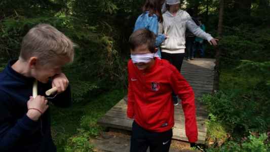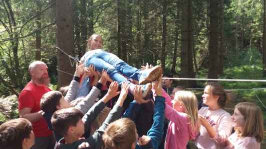 Am Dienstag fertigte jeder Schüler ein eigenes Schwertgehänge aus Leder an und schnitzte ein Schwert aus Holz. Nachmittags gingen wir in den Wald und bewältigten so manche Gemeinschaftsprüfung. Wir mussten zum Beispiel blind Klanghölzern folgen und uns gegenseitig bei dem Spiel „Ausbruch aus der Burg“ über verschieden hohe Seile heben. Nur so konnten wir ins Freie gelangen. In der Dämmerung gingen wir mit unseren Lehrern abermals in den Wald, um ihn am Abend zu erleben. Auch zwei kleine Mutproben erwarteten uns dort: Mit verbundenen Augen mussten wir an einem zwischen Bäumen gespanntem Bergseil entlang gehen. Außerdem sollten wir 15 Minuten alleine, nicht in Sichtweite der anderen Schüler, leise im Wald sein. Nachdem wir alle Prüfungen bestandenen hatten, erhielten wir am Lagerfeuer eine Urkunde und wurden zu Rittern und zu Ritterinnen geschlagen. Zum Ritterschlag trug der Naturpädagoge mittelalterliche Kleidung.