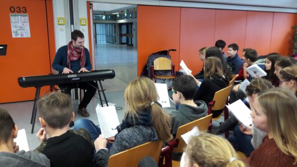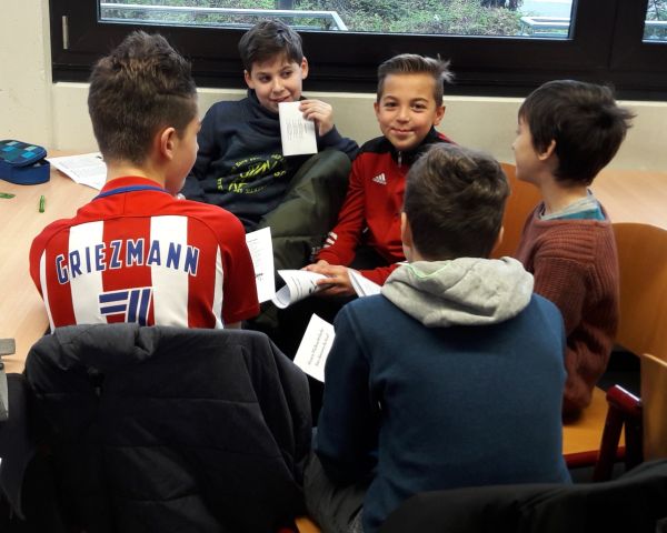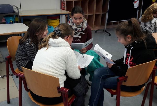 Am 14. Dezember hatten sich 26 Schüler und Schülerinnen aus einer bilingualen Klasse im Elsass gemeinsam mit ihrer Lehrerin Frau Fröhlich auf den Weg nach Wörth gemacht, um dort den Tag mit der Klasse 6e von Frau Bräutigam zu verbringen. Nachdem die Schüler sich in Kleingruppen zusammengefunden und für ihre Gruppe einen Namen ausgedacht hatten, konnte es richtig losgehen. Alle Schüler erhielten sowohl deutsche als auch französische Weihnachtslieder. Diese sollten sie sich gegenseitig in ihren Gruppen laut vorlesen und somit gleichzeitig ihre Aussprache in der Fremdsprache trainieren. So getan, galt es nun die eingeübten Weihnachtslieder zu singen.