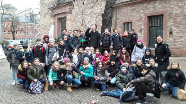 Für den Nachmittag stand ein Besuch auf dem Karlsruher Weihnachtsmarkt auf dem Programm. Doch bevor wir uns dahin aufmachten, stärkten sich alle Schüler noch an dem von der Klasse 6e vorbereiten Brunch. In Karlsruhe hieß es dann erneut in zweisprachigen Gruppen zusammen- zuarbeiten und die Aufgaben der Weihnachtsmarktrallye zu lösen. Einige Schüler sangen dort noch einmal, denn es galt z. B. einen Passanten zum gemeinsamen Weihnachtsliedersingen zu überreden und davon ein Video zu drehen. Viel zu schnell ging dieser Nachmittag zu Ende und die Klasse 6e wurde lauthals von ihren neuen französischen Freunden in Karlsruhe verabschiedet. Wir freuen uns bereits auf unseren Besuch in La Wantzenau und Strasbourg im Frühling.
