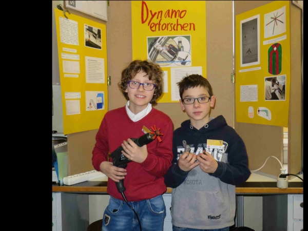Philippe Klingner und Samuel Samuel Baumann (beide Klasse 6f ) haben in der Sparte Physik das Projekt "Dynamo erforschen" vorgestellt. Sie fanden heraus, wie ein Fahrraddynamo aufgebaut ist, wie er funktioniert und führten Versuche durch, um ein noch leistungsstärkeres Modell zu entwickeln. Die beiden gewannen als Sonderpreis ein Jahresabonnement der Zeitschrift Geolino.
