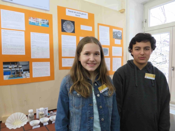 Laura Schmidt und Abdelkader Lakhdar (Klasse 6f und 6c)) erforschten einen Sand, mit dem sich keine Sandburgen bauen lassen. Dieser besondere Sand ist wasserabweisend, d.h. das Wasser perlt ab, anstatt den Sand zu benetzen. Sie fanden sogar eine Methode selbst einen solchen wasserabweisenden Sand herzustellen. Sie präsentierten ihre Arbeit in der Sparte Chemie. Abdel_Laura.jpg