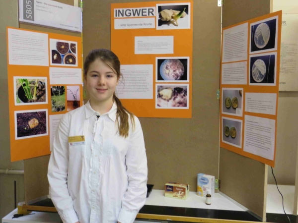 Bastienne Boltz (Klasse 6f) entdeckte in Ingwer eine spannende Knolle. Sie untersuchte, ob aus einem Ingwerstück eine neue Pflanze wachsen kann, woher der junge Keimling seine Energie erhält und ob Ingwerprodukte das Bakterienwachstum wirklich hemmen. Ihre Arbeit wurde in der Sparte Biologie mit dem dritten Preis ausgezeichnet.