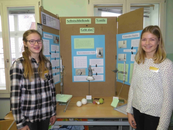 Sarah Vogel und Lisa Bürger (beide Klasse 8e) sind in der Sparte Technik mit dem Projekt "selbstschließende Ventile" angetreten. Die beiden haben sich drei unterschiedliche Wasserventile ausgedacht, diese konstruiert und getestet. Die Ventile können zum automatischen Befüllen von Regentonnen zur Gartenbewässerung eingesetzt werden.