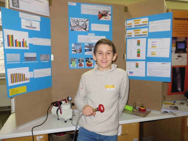 Lucas Mayr (Klasse 6f) hörte von Packrobotern, die Pakete fallen ließen und fragte sich, wie man dies verhindern könnte. Da die Packroboter die Pakete ansaugen, entwickelte er ein Prüfsystem mit dem er die Luftdurchlässigkeit von Verpackungspapieren bewerten konnte. Für seine Arbeit wurde er mit dem Sonderpreis der Firma Mondi Bad Rappenau ausgezeichnet. Lucas präsentierte seine Arbeit in der Sparte Arbeitsweilt.