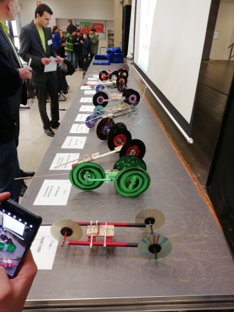 Seit dem ersten Wettbewerb legten die Konstruktionsregeln die Maße der Fahrzeuge sowie die verwendbaren Materialien fest. So durften zum Beispiel von Anfang an keine fertigen Bauteile aus Systembaukästen verwendet werden. Im laufenden Jahr wurden die Bedingungen nochmals verschärft durch den Ausschluss von Kugellagern, die bei vielen Fahrzeugen für ein möglichst reibungsarmes  Ausrollen sorgten. Angespornt durch diese schwierigen Bedingungen entwickelte das diesjährige Team des EGW  -  Anton Hoffmann, Felix Huber, Maximilian Herbst und Richard Kunst (10c)  -  eine neuartige Fahrzeugkonstruktion: ein zweirädriges Fahrzeug.