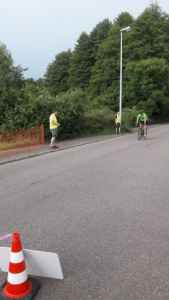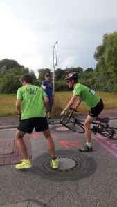 Den Beginn machte Alicia Gabriel. Sie schwamm die 400 Meter im Hallenbad Schifferstadt. Obwohl krankheitsbedingt noch geschwächt, kam sie nach 6:26 Minuten ins Ziel. Trotzdem bedeutete das nach dem Schwimmen Platz 13 für das EGW. Für jeden Schwimmer war es schwer, nach dem Absolvieren der Strecke noch aus dem Hallenbad heraus die 100 Meter auf die Straße zur Wechselzone zu rennen. Fabian Brune wartete mit dem Fahrrad und begab sich nach erfolgreichem Wechsel auf die 20 Kilometer Fahrradstrecke. Fabian bewältigte die 20 Kilometer in 37:45 Minuten. Mit einem halben Sturz beim Absteigen vom Rad vor der Wechselzone vollzog er dann den Wechsel zu dem Läufer Niklas Lederer. Auch Niklas litt unter einer Erkältung. Er rannte tapfer 5 Kilometer rund ums Schifferstädter Stadion in der prallen Sonne. Trotz allem schaffte er es, unter der 20-Minuten-Schallmauer zu bleiben (19:51 Minuten). Dies war immerhin noch die zehntbeste Laufzeit im Staffelfeld.