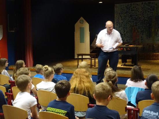 Französischunterricht mal anders stand am Donnerstag, den 14.06.2018 auf dem Plan einiger 6. und 7. Klassen: Statt zum Klassenzimmer ging es in das schuleigene Kellertheater. Auf der Bühne stand dort jedoch keine Lehrkraft, sondern Jean-Philippe Devise, ein waschechter Franzose und Schriftsteller von Beruf. Augenzwinkernd erzählte dieser den Schülern, dass er am liebsten Kurzgeschichten schreibe, da dies schneller ginge und es ihm für einen echten Roman an der nötigen Disziplin mangele. Mit lebendiger Mimik und Gestik las M. Devise aus seinem Buch „Ein Umweg und andere Geschichten“ vor und lud die Schüler durch „J’aime les questions. Posez-moi des questions.“ immer wieder ein, ihm Fragen zu sich oder seinen Geschichten zu stellen. Dies nahmen die Schüler gern an und erfuhren, dass M. Devise schon seit 30 Jahren in Deutschland lebt. Er spricht Deutsch, Französisch, Englisch und ungefähr zehn Wörter Russisch und schon als Kind habe er mit dem Schreiben begonnen. Damals wunderte es ihn, dass Erwachsene oft genau das Gegenteil von dem sagen, was sie meinen. Diesem Umstand wollte er in seinen Texten auf den Grund gehen. Später entdeckte er, dass man mit dem Schreiben von Geschichten bei den Mädchen leichter punktet und so blieb er dabei.