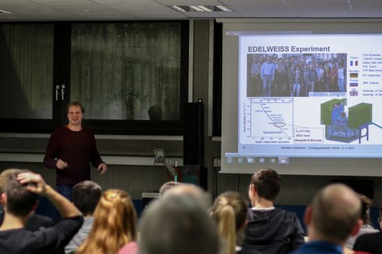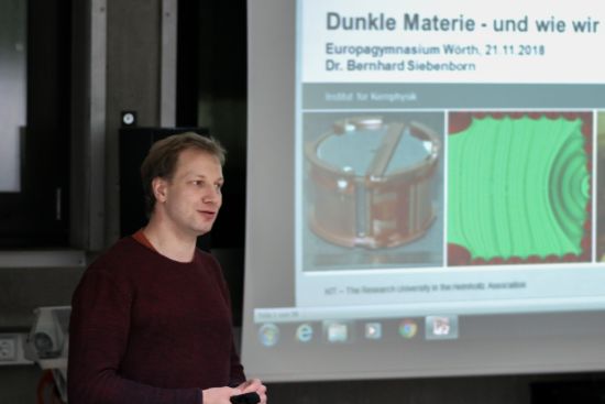 Über einen privaten Kontakt konnte daher Dr. Bernhard Siebenborn, Forscher am Kernphysikalischen Institut des KIT, gewonnen werden, der sich seit seiner Diplomarbeit mit dem Thema beschäftigt. Vor rund sechzig interessierten Zuhörern – Schülerinnen und Schülern von Klasse 6 bis 13, Kolleginnen und Kollegen nicht nur aus dem Physikfachbereich und auch einigen interessierten Eltern – erzählte Dr. Siebenborn anhand vieler anschaulicher Vergleiche und Beispiele von der bisher erfolglosen Suche nach den WIMPs, den Weakly Interacting Massive Particles, die rund 26% des Universums ausmachen sollen. Die vielen Fragen auch von Schülern im Anschluss an den Vortrag zeigten, wie spannend die Beschäftigung mit wissenschaftlichen Themen sein kann, selbst wenn man noch keine Ergebnisse vorweisen kann.