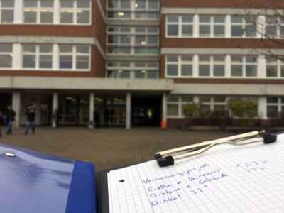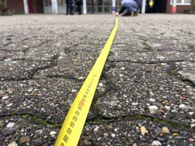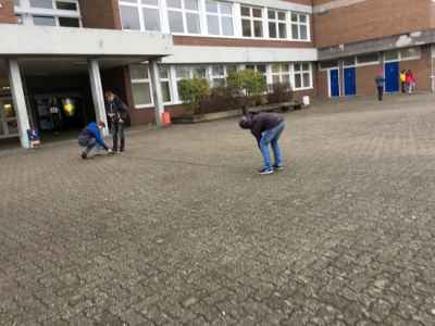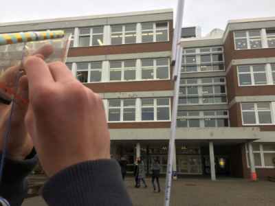 Anfang Februar haben wir, die Schüler der Klasse 8e, in einer Mathestunde die Höhe des Schulgebäudes (obere Kante des dritten Stockwerks) und der Sporthalle ermittelt.