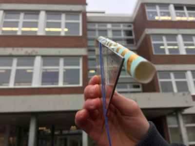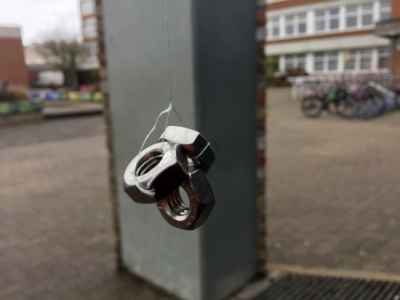 Zuhause haben wir eigene Winkelmessgeräte aus Alltagsgegenständen hergestellt. Dafür haben wir am Geodreieck eine Schnur mit einem schweren Gegenstand befestigt (zum Beispiel Schraubenmuttern als „Senkblei“) und einen Strohhalm an die obere Kante geklebt. Um die verschiedenen Höhen bestimmen zu können, mussten wir sowohl die Entfernung zum entsprechenden Gebäude als auch den Blickwinkel zwischen der oberen Kante des Gebäudes und der Horizontalen messen. Auf diese Weise konnten wir mit Hilfe des passenden Kongruenzsatzes und maßstäblicher Zeichnung die unzugänglichen Höhen ermitteln.