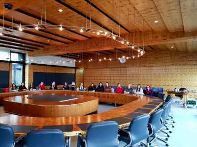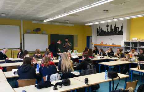 Nach dem sehr interessanten und informativen Vortrag ging es für uns Schüler zurück zur Schule. Wir hatten im Vorfeld kurze Vorträge zu speziellen Aspekten unseres Schulbaus aus Schülersicht vorbereitet, die wir bei einem Rundgang im Schulgebäude den Studierenden vortrugen - denn die Studenten wären ja umsonst gekommen, hätten wir Ihnen nicht den begehrten 70er Jahre Bau im Detail gezeigt.