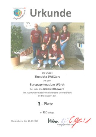 Am Sonntag, den 19.05.19, fand der diesjährige Kreiswettbewerb vom Jugendrotkreuz des Kreisverbandes Germersheim in der Grundschule in Rheinzabern statt. Bei diesem Wettkampf zeigten die verschiedenen Jugendgruppen von Ortsvereinen und auch Schulsanitätsdienste der gesamten Region in verschiedenen Stufen und Kategorien ihr Können. Die Schulsanitäter des Europa-Gymnasiums waren in diesem Jahr mit zwei Mannschaften vertreten.