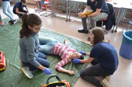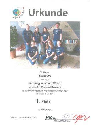 Nach einem abwechslungsreichen, sechsstündigen Wettkampf war die Sensation perfekt: Unsere Schulsanitäter hatten es tatsächlich geschafft, zwei der Pokale mit nach Hause zu nehmen! In der Stufe „Schulsanitätsdienst“ belegte unser Team mit dem Gruppennamen "SEGWays" mit Fabienne Fahrentholz, Isabel Decker, Catarina Ciani, Jessica Vollmer, Valeria Schmitt und Mirja Koffler den ersten Platz und unser Team mit dem Gruppennamen „The sickx SWEGers“ mit Jennifer Gehrlein, Victoria Boltz, Joshua Gerndt-Eisenhower, Lara Schwarz und Julius Nagel den dritten Platz. Betreut wurden sie von Herrn Holländer und Herrn Heinzler.