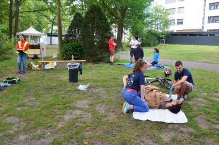 Insgesamt gab es am Samstag bei einem Parcour durch Wörth sechs Stationen zu meistern. An der Station "Erste-Hilfe-Gruppe" galt es drei Verletzte zu versorgen: Eine Person bekam nach einem Herzinfarkt einen Herzstillstand und musste Wiederbelebt werden. Eine zweite Person musste nach einem Fahrradsturz versorgt werden, die dritte Person erlitt einen Schock. Bei der Station "Erste-Hilfe-Einzel" gab es eine bewusstlose Person, ein Bauchtrauma sowie eine Person mit Atemstörungen nach dem Verschlucken eines Kaugummis zu versorgen. Im Musisch-Kulturellen-Bereich musste eine Geschichte mithilfe von Emojis erzählt werden. Bei der Station "Rotkreuz" mussten Fragen zum Roten Kreuz mit dem Schwerpunkt Humanitäres Völkerrecht und Zivilcourage beantwortet werden. Aufgelockert wurden diese Stationen durch mehrere Sport-und Spielaufgaben. Nach einem abwechslungsreichen Tag fieberten wir der Siegerehrung entgegen, die am nächsten Tag stattfand.