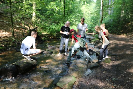Auf der Burg angekommen teilten wir uns in verschiedene Arbeitsgruppen auf und bekamen unterschiedliche Aufgaben gestellt. Nach dem Mittagessen des super engagierten Küchenteams, das sich nach Ankunft sogleich ans Werk machte, hieß es für uns: Hosenbeine hochrollen und ab in den Bach!