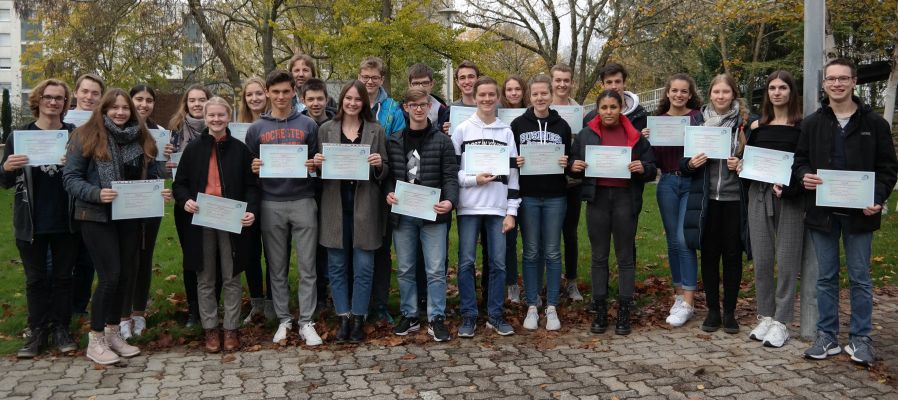 Nach einjähriger Vorbereitung unterzogen sich im Mai 26 Schülerinnen und Schüler am Institut Français der DELF-Prüfung. Am heutigen Tag überreichte Herr Hauptmann den Absolventen die vom französischen Bildungsministerium ausgestellten Sprachdiplome. Zum erfolgreichen Bestehen und den ausgezeichneten Ergebnissen gratulieren wir Charlotte Balzer (MSS 12), Gabriel Baumann (MSS 11), Jonathan Baumann (MSS 13), Jonathan Becker (MSS 11), Eliz Bekmez (10c), Kenza Cherfouf (10g), Elias Gerndt-Eisenhower (MSS 12), Laura Grohmer (MSS 11), Laura Höfler (MSS 11), Jakob Klöffer (10g), Elena Mühl (10g), Hannah Nahm (MSS 12), Jonathan Pflüger (MSS 12), Luis Pflüger (10g), Emile Riether (10g), Luis Tiago Sartingen (MSS 12), Felix Schmitz (10g), Qérèn Scholtes (10g), Benedikt Schwarz (10g), Lucy Spandl (MSS 12), Sebastian Strauch (MSS 11), Malte Taraschewski (10g), Emanuel Wambold (10g), Julia Wehefritz (MSS 11), Luisa Wehefritz (10g) und Lara Wolf (10c).