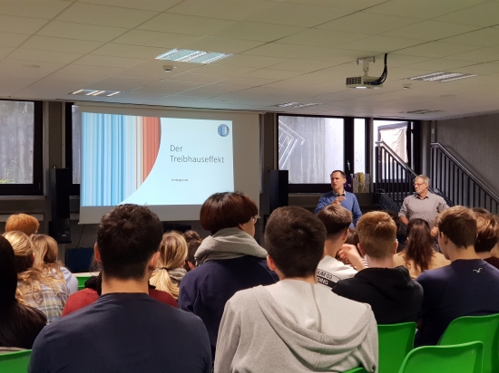 Eingeladen von einer engagierten und Klima-interessierten Schülergruppe kamen am Dienstag, dem 26.11.19, die vier Wissenschaftler Dr. Volker Stelzer (KIT), Dr. Markus Neuwirth (KIT), Jan George vom Fraunhofer-Institut für System- und Innovationsforschung (IS) und Dipl. Päd. Michael Zonsius an das EGW und begannen nachmittags mit Ihrem Workshop. Obwohl es den Schülern frei stand, nach Hause zu gehen, war das zur Verfügung gestellte Kellerkino mit motivierten Schülern der 7. bis zur 13. Klassenstufe sowie einigen Lehrern gefüllt.