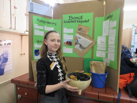 Biomüll – kinderleicht entsorgt?! Lea Sophie Schmitt (6b) untersuchte verschiedene Verpackungen von Biomüll auf Kompostierbarkeit. Nachdem sie festgestellt hat, dass es zur Papiertüte keine sinnvolle Alternative gibt, experimentierte sie mit verschiedenen Papiersorten und bestimmte die Zeit, in der die Tüten der Nässe standhalten. Mit dem ersten Platz bei der Sparte Schüler experimentieren/Arbeitswelt hat sich Lea Sophie für die Teilnahme am Landeswettbewerb „Schüler experimentieren“ qualifiziert.