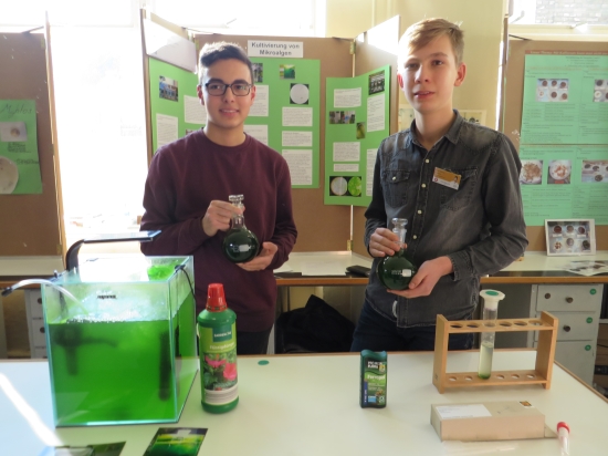 Abdelkader Lakhdar (8c) und Noah Wiese (8f) beschäftigten sich mit der Frage, wie sich das Wachstum von Mikroalgen fördern lässt, um aus dem kultivierten Algenstamm Öl als nachwachsenden Rohstoff gewinnen zu können. Die Arbeit belegte bei der Sparte Schüler experimentieren/Biologie den zweiten Platz und wurde mit dem Sonderpreis „Nachwachsende Rohstoffe“ ausgezeichnet.