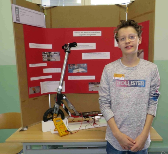 Philippe Klingner (8f) hat die chaotischen Verhältnisse von leihbaren Elektro-Scootern in Großstädten zu seinem Thema gemacht. In einer von ihm entwickelten Vorrichtung kann man den Roller ordentlich abstellen und der Akku wird obendrein noch kabellos durch Induktion geladen. Sein Projekt wurde mit dem dritten Platz bei der Sparte Schüler experimentieren/Physik ausgezeichnet.