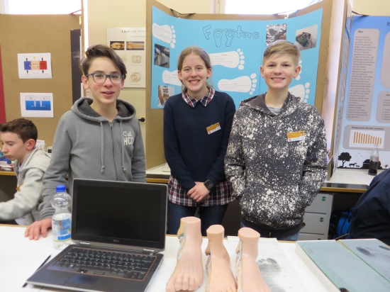 Samuel Baumann, Annika Schmidt und Vincent Goldschmidt (alle 8f) nahmen mit dem Projekt "Footure- Weil uns Füße wichtig sind!" bei der Sparte Schüler experimentieren/Technik teil und wurden mit dem dritten Platz und dem Sonderpreis AOK Gesundheit prämiert. Zur Herstellung von individuell an die Fußform angepassten Schuheinlagen bauten sie eine Vorrichtung zur Vermessung der Fußunterseite im belasteten Zustand. Aus den gewonnenen Daten lässt sich mit einem 3D-Drucker schnell, kostengünstig und umweltfreundlich eine personalisierte Schuheinlage herstellen.