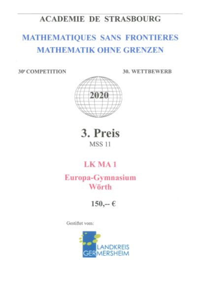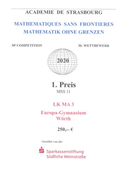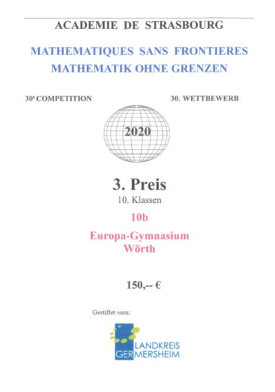 Da in diesem Jahr aufgrund der Covid-19-Epidemie und der daraus resultierenden Maßnahmen leider keine offizielle Preisverleihung stattfinden kann, müssen die Gewinner notgedrungen auf die Feier selbst als auch auf die traditionelle deutsch-französische Stadtrallye verzichten. Auch ein Gruppenfoto der Preisträger war nur geteilt in A- und B-Gruppen aufgrund des wöchentlich wechselnden Schulbetriebs möglich. Allen Preisträgern gratulieren wir ganz herzlich zum Erfolg und wünschen weiterhin viel Spaß bei der Mathematik.