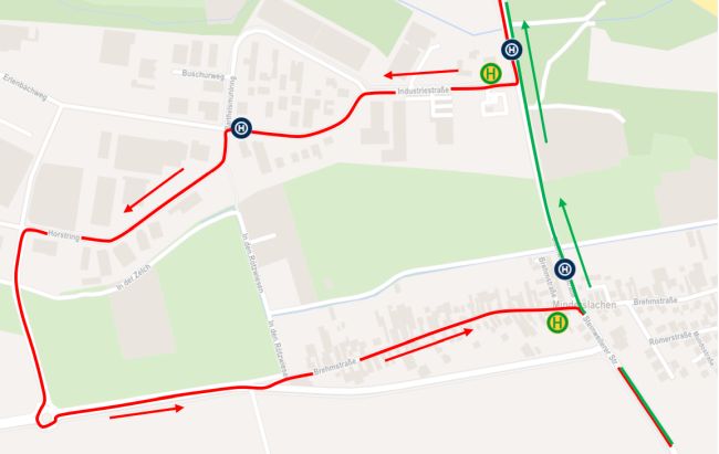 Aufgrund von Bauarbeiten können die Haltestellen „Minderslachen, Brehmstraße“ und „Minderslachen, Industriestraße“ bis zum 28.08.2020 nicht von den Linien 548 und 594 in Richtung Kandel bedient werden. Ersatzhaltestellen sind in der Industriestraße sowie Brehmstraße eingerichtet. Aufgrund der Umleitungsstrecke über das Industriegebiet Horst muss mit Verzögerungen in Richtung Kandel gerechnet werden. Für die unvermeidlichen Erschwernisse bitten wir um Verständnis.