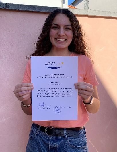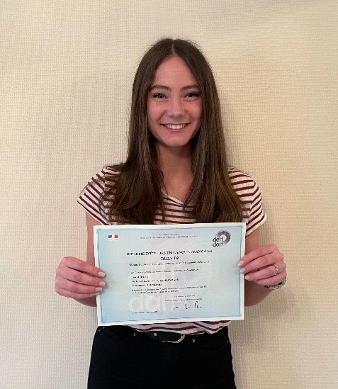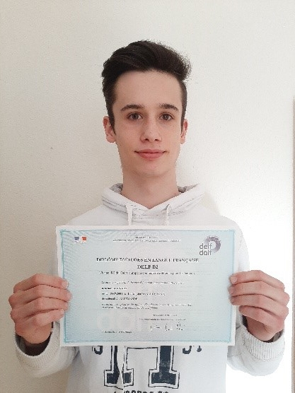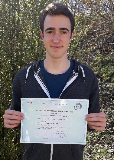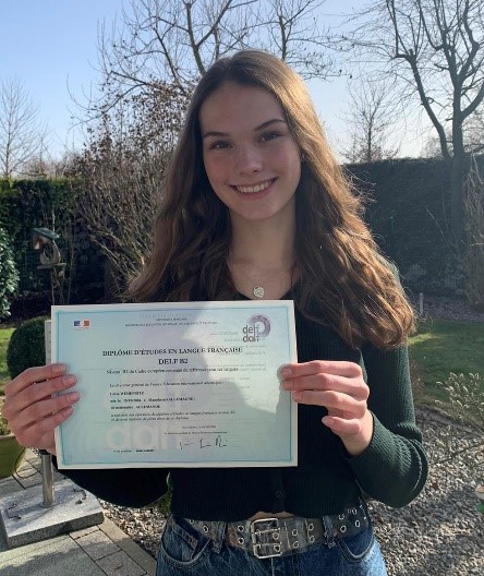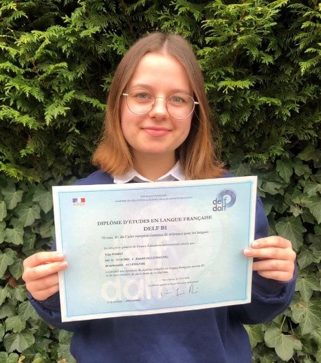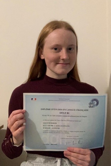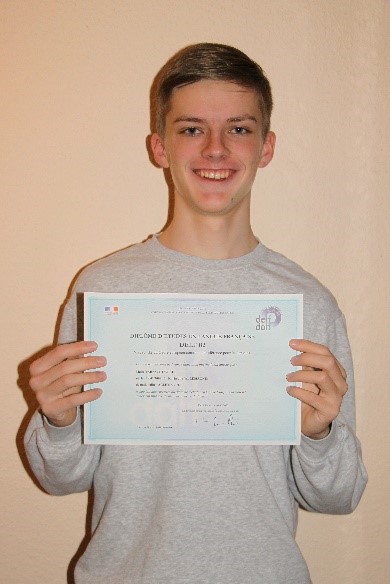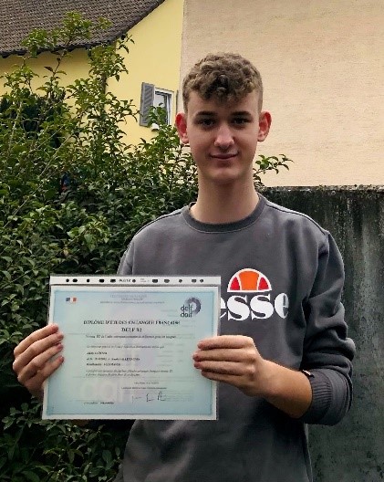 „Wer gut Französisch kann, hat einen Vorteil - und hat ihn mit der DELF-Urkunde sogar schwarz auf weiß!“ Mit diesen Worten und einem Strahlen schaut Jonathan Becker auf sein Zertifikat, das ihm nicht nur hervorragende Sprachkenntnisse bescheinigt, sondern mit dem Niveau B2 auch den Zugang zu französischen Universitäten ebnet. Außer Jonathan haben zwölf weitere Schülerinnen und Schüler im letzten Sommer die DELF-Prüfung erfolgreich absolviert. Dass die Vorbereitung ihre Schultage am Freitagnachmittag verlängert hat, ist bei der Freude über das Resultat schnell vergessen. „Das gemeinsame Lernen in der Gruppe hat sehr viel Spaß gemacht, da immer eine gute Stimmung war“, meint Luisa Wehefritz rückblickend. Qérèn Scholtes fügt hinzu, dass sie sich durch die Vorbereitung den Prüfern trotz aller Aufregung selbstbewusst präsentieren konnte, und ist dankbar, dass die Prüfungen trotz pandemiebedingter Einschränkungen ermöglicht worden sind. Für Jakob Klöffer haben sich mit dem DELF sogar die Weichen für die Oberstufe gestellt: „Mir hat es einfach viel mehr Sicherheit beim französisch Sprechen und Schreiben gegeben. Die DELF-Treffen waren neben dem normalen Unterricht die optimale Möglichkeit zu üben und mich so zu verbessern, dass ich mich dazu entschieden habe, Französisch als Leistungskurs zu wählen.“ Cécile Daub bleibt in der Prüfungssprache und resümiert: « Le DELF peut être très bien maîtrisé pendant la scolarité. C'est une expérience positive et le repas de tarte flambée après avoir passé l'examen a été très amusant. »