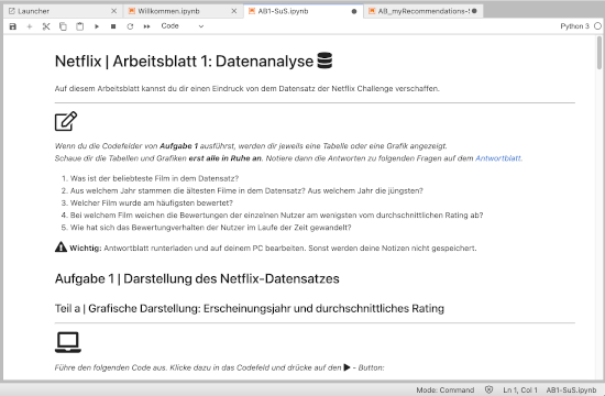 Im Workshop arbeiteten wir mit den originalen Daten der Netflix Challenge und entwickelten unser eigenes Empfehlungssystem. Während mehreren BigBlueButton-Konferenzen haben wir uns zusammen mit 3 Betreuer*innen getroffen, die uns durch den Workshop begleitet haben und uns immer geholfen haben, wenn wir nicht weiter gekommen sind. Der Workshop hatte 3 Einheiten à 1h 45min. Zu Beginn sollten wir uns auf einer Website einloggen, auf der wir die Aufgabenblätter sowie ein Antwortenblatt einsehen konnten. Wir wurden dann in 2er bis 3er Gruppen in Breakout-Räume geschickt und haben uns dann selbstständig Lösungen erarbeitet. Nach jeweils circa 20 Minuten haben wir uns dann wieder in der großen BBB-Runde getroffen und die Aufgaben besprochen. Teilweise haben die Grafiken auf dem Aufgabenblatt nicht (sofort) geladen, deswegen konnte es sein, dass man etwas hinterherhing, wenn man die Aufgaben im BBB-Raum besprochen hat. Trotzdem ist man sehr gut mitgekommen, auch, wenn man 1-2 Aufgaben überspringen musste. Unser Kurs hatte schon die Grundvoraussetzungen, um den Workshop bearbeiten zu können, das heißt der Workshop hatte viel mit Matrizen zu tun, welche wir im Unterricht aktuell behandeln. Allerdings wurde das Thema sehr gut eingeführt, weshalb ich denke, dass auch Personen, die sich noch nicht mit dem Thema beschäftigt haben, ganz gut mitkommen würden. Während der ganzen Zeit über waren die Betreuer*innen immer bereit, zu helfen.