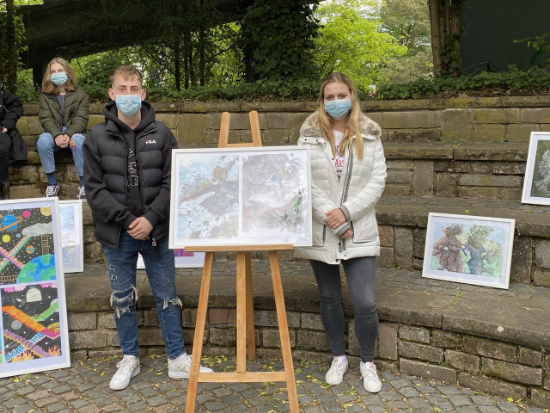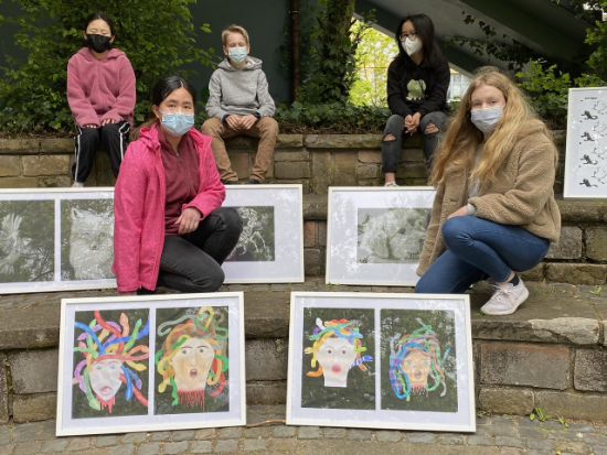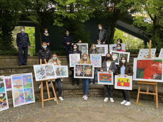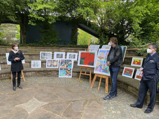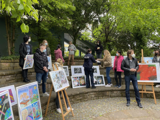 Am 21. Mai 2021 fand die 2. Vernissage statt, coronabedingt diesmal im Freien und vor Ort in der Schule am idyllischen Europa-Brunnen. Nach der herzlichen Begrüßung durch Schulleiter Dr. Hauptmann und den einführenden Worten von Kunstlehrerin Frau Brand Scheffel bekräftigte der Dienststellenleiter Herr Lederer die fruchtbare Zusammenarbeit mit dem EGW. Tolle inspirierende Arbeiten direkt am Arbeitsplatz erfreuen die Kolleginnen und Kollegen immer wieder aufs Neue. Trotz teils heftigem Wind und coronabedingter Umstände waren die Schülerinnen und Schüler sichtlich stolz ihre Arbeiten nun professionell gerahmt und ausgestellt zu sehen.