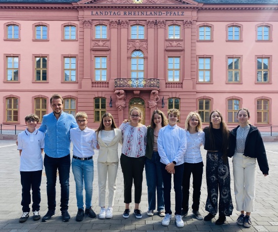 Es geht Schlag auf Schlag für die AG „Schülerwettbewerbe“: Nachdem die Schülerinnen und Schüler vor einigen Wochen durch ihren Hauptpreis beim Schülerwettbewerb der Bundeszentrale für politische Bildung 600€ Preisgeld gewonnen hatten, feierten sie vergangene Woche den nächsten Erfolg: Bei „Mitgedacht – mitgemacht“, dem Schüler- und Jugendwettbewerb des Landtages Rheinland-Pfalz in Zusammenarbeit mit der Landeszentrale für politische Bildung, räumten Charlotte Funk (7c), Julia Griesbeck (7c), Mariella Haas (7c), Steffen Steeg (7c), Torben Weber (7c), Jarno Werling (7c), Joeline Baumann (9f), Amaya Hoffmann (9f) und Marietta Wronka (9f) den 1. Preis in der Kategorie „Gymnasium, Sekundarstufe I“ ab. Ihr Videobeitrag in der Kategorie „Glückwunsch zum Jubiläum! 75 Jahre Rheinland-Pfalz“ überzeugte die Jury, welche in ihrer Laudatio vor allem die Multiperspektivität, die Interviews mit verschiedenen Vertreterinnen und Vertretern aus der Politik sowie die eigens erstellte Umfrage unter den Schülerinnen und Schülern des Europa-Gymnasiums lobte. So erhielten die Lernenden in der imposanten Atmosphäre des Plenarsaals im rheinland-pfälzischen Landtag von Bernhard Kukatzki, Präsident der Landeszentrale für politische Bildung, und Hendrik Hering, Präsident des rheinland-pfälzischen Landtages, ihre Urkunde und einen phantastischen Preis: Sie erhalten nach vielen schwierigen Monaten der Pandemie ein schönes gemeinsames Erlebnis in Form eines Tagesausflugs, den die Landeszentrale für politische Bildung vollständig sponsert. Auch der Schulleiter Herr Dr. Hauptmann und der AG-Leiter Herr Bertram sind mächtig stolz und sprechen den Teilnehmenden ihre Glückwünsche aus!