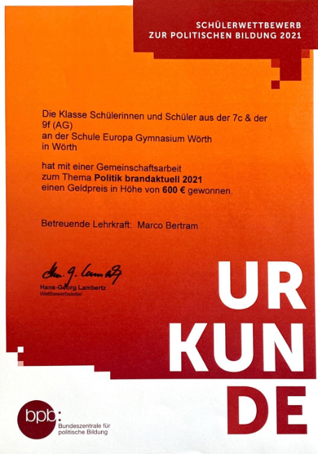 Torben Weber, Steffen Steeg, Jarno Werling, Charlotte Funk, Julia Griesbeck und Mariella Haas (alle 7c) sowie Amaya Hoffmann, Marietta Wronka und Joeline Baumann (alle 9f) überzeugten die Jury mit einem Video zum Thema „Politik brandaktuell“, welches sie unter der Leitung von Herrn Bertram erstellten. Darin beleuchteten sie die aktuelle Situation in der Region Wörth und griffen dabei unter anderem sowohl auf ein Expertengespräch mit dem Wörther Bürgermeister, Dr. Dennis Nitsche, als auch auf eine selbst durchgeführte Umfrage am Europa-Gymnasium zurück.