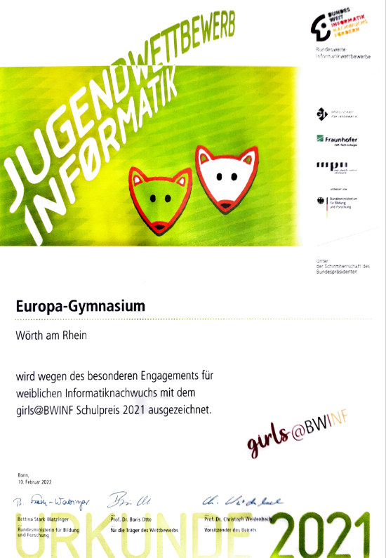 Das Europa-Gymnasium wurde erneut als „BwInf-Schule 2021/2022“ ausgezeichnet und erfährt damit eine Anerkennung für die besondere Förderung von Informatik-Nachwuchs, als eine von nur 23 Schulen im Bundesgebiet. Der Bundeswettbewerb Informatik ist der wichtigste deutsche Schülerwettbewerb für junge Informatik-Talente. Insgesamt 12 Schülerinnen und Schülern aus den Leistungskursen 11 und 12 haben sich an der Jubiläums-Ausgabe des anspruchsvollen Wettbewerbs beteiligt und damit die starke Rolle des Fachs Informatik am Europa-Gymnasium unterstrichen. Durch die erzielten Ergebnisse und die hohe Teilnehmeranzahl konnte das Europa-Gymnasium sogar den BwInf-Schulpreis in Gold gewinnen. Zudem konnte das Europa-Gymnasium im „Jugendwettbewerb Informatik“ (JWInf) als eine von nur fünf Schulen bundesweit die Auszeichnung „Girls go BwInf“ erzielen. Hier gelang es einer großen Anzahl an Teilnehmerinnen die geforderten Aufgaben zu lösen. Alle Teilnehmerinnen und Teilnehmer bekamen darüber hinaus Urkunden und kleine Sachpreise überreicht.