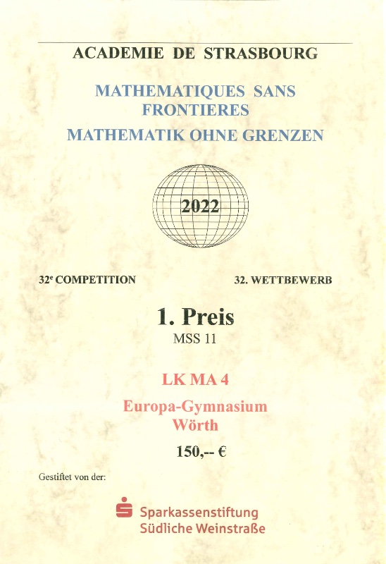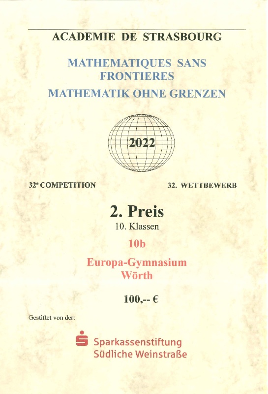 Da in diesem Jahr aufgrund der Covid-19-Epidemie und der daraus resultierenden Maßnahmen leider keine offizielle Preisverleihung stattfinden kann, müssen die Gewinner notgedrungen auf die Feier selbst als auch auf die traditionelle deutsch-französische Stadtrallye verzichten. Die Urkundenverleihung fand schulintern zusammen mit Schulleiter Herr Dr. Hauptmann und Mathematiklehrer Herr Heinzler statt. Allen Preisträgern gratulieren wir ganz herzlich zum Erfolg und wünschen weiterhin viel Spaß bei der Mathematik.