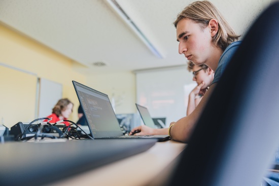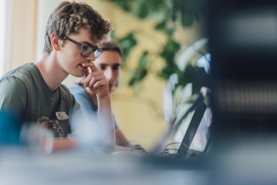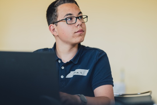 Jonas Hardardt (10) beim Workshop ,,Kreative Datenanalyse mit Snap!“ | Leonard Grill (11) beim Arbeiten mit der Programmiersprache Snap! |