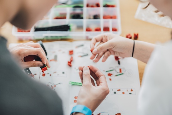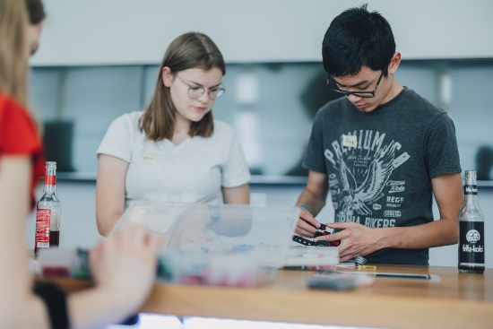 Nina Hoffmann (12) und Duy Nguyen (11) bei der Konstruktion von einem Fahrzeug mit Hilfe von technischen Bausteinen. |