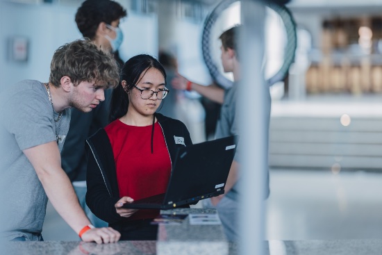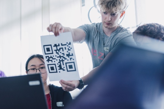Ein QR-Code wird von der Laptop Kamera eingelesen, bevor es zum Programmieren der Drohnen kommt. | Quynh Nhu Nguyen (11) beim Programmieren der Steuerung von einer Drohne mit Hilfe eines Betreuers. |