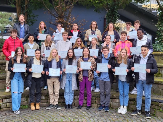 Im vergangenen Schuljahr haben sich wieder viele Schülerinnen und Schüler unserer Schule auf die Sprachprüfungen des Institut Français vorbereitet. 36 von ihnen haben sich im Sommer der Prüfung unterzogen und diese erfolgreich absolviert. Nach langer Zeit des Wartens erhielten sie nun aus den Händen des Schulleiters Herrn Hauptmann die vom französischen Bildungsministerium ausgestellten Urkunden. Er würdigte ihr Engagement und gratulierte zum erfolgreichen Bestehen.