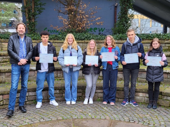 Über das Bestehen der DELF-Prüfung B2 freuen wir uns mit: Samuel Baumann, Mika Diallo, Anne Klöffer, Mina Logé, Annika Schmidt, Jana Wambold und Noah Wiese.