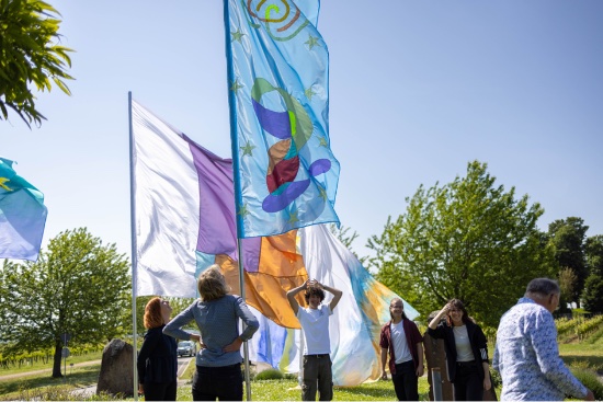 Jetzt sind die Fahnen dem Wind freigegeben und wehen in der deutsch-französischen Grenzregion. Sie bleiben somit immer in Bewegung, denn Wind ist eine immerwährende Strömung, die Luftdruckunterschiede ausgleicht.