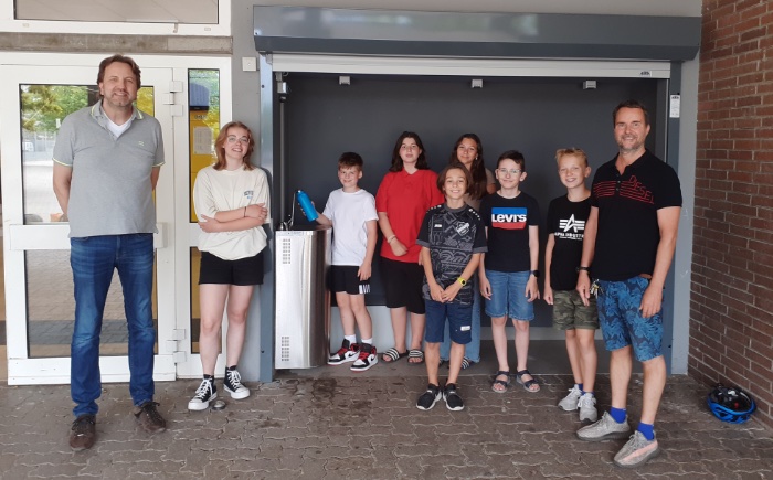 Pünktlich zu den heißen Tagen, kurz vor den Sommerferien, wurde der neue Wasserspender am Pausenhof Süd am Europa-Gymnasium Wörth eröffnet.