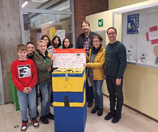 Wir haben Sie feierlich mit dem Schuldirektor Herrn Hauptmann eingeweiht. Seit einem dreiviertel Jahr wird sie nun von den Schülerinnen und Schülern für die Entsorgung von Pfandflaschen und -dosen benutzt. Alle paar Monate hat die Umwelt AG den Pfand beim nahegelegenen Supermarkt eingelöst. Nun ist der erste größere Pfanderlös von 110 Euro zusammengekommen. Wir haben über die Verwendung abgestimmt und haben die "Tafel in Wörth" mit der Spende bedacht. Im nächsten Jahr überlegen wir auf ein Neues an welche gemeinnützige Organisation wir den Pfanderlös spenden möchten.