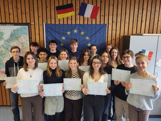 Das Sprachzertifikat B2 erwarben Maria Balu, Joeline Baumann, Vanja Buck, Yassin Cherfouf, Marie Engel, Cyriace Guéguen, Amaya Hoffmann, Paula Hühn, Yannis Kinateder, Johannes Marz, Lucien Péguret, Mathilde Riether, Marie Roloff und Hannah Wissel. Auch ihnen gelten unsere Glückwünsche.