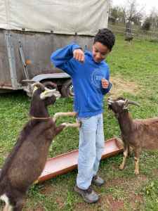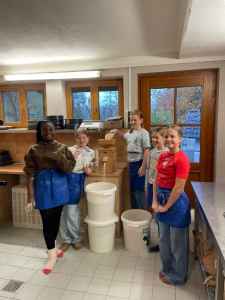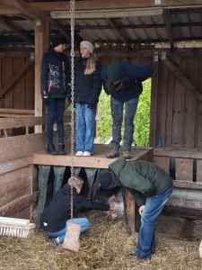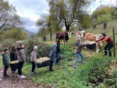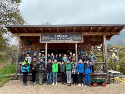 Wir waren mit unserer Klasse auf dem Bauernhof Gut Hohenberg in Queichhambach bei Annweiler. Dort gibt es viele Tiere: Schweine, Esel, Schafe, Ziegen, Hühner und Kühe. Am besten haben uns die Esel gefallen. Außerdem gibt es auch Islandpferde, die allerdings nicht dem Hof gehören und etwas weiter weg stehen. Unsere Klasse wurde in vier Gruppen eingeteilt. Die Backgruppe hat Brote für unser Frühstück, das Abendbrot und den Hofladen gebacken. Sogar Zimtschnecken und Stockbrot haben wir mit Ivanas Hilfe, der Bäckerin vor Ort, gebacken. Die Kochgruppe hat das Essen für uns, die Mitarbeiter des Hofes und den Montessori-Kindergarten gekocht. Um die Tiere hat sich die Tiergruppe gekümmert. Egal ob Schwein oder Huhn, alle mussten gefüttert und gepflegt werden. Die Hof- und Feldgruppe hat den Hof in Schuss gehalten und war für das Warmwasser verantwortlich, denn der Hof wird mit Holz beheizt. Die Gruppenzusammensetzung blieb gleich, aber die Aufgaben rotierten.  Die verschiedenen Aufgaben waren für alle spannend und aufregend. Wir würden sehr gerne noch einmal zum Bauernhof zurückkehren und bedanken uns bei Frau Haas und Herrn Hellenthal für die tolle Klassenfahrt.
